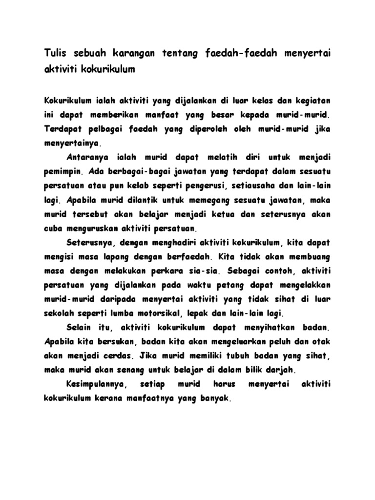 Karangan bahagian b faedah aktiviti kokurikulum kepada murid. Kepentingan Aktiviti Kokurikulum. Aktiviti kokurikulum seperti sukan kem kepimpinan dan program kerohanian merupakan aspek penting dalam melahirkan remaja yang serba boleh. Kegiatan tersebut termasuklah aktiviti badan beruniform kelab dan persatuan serta sukan dan permainan.