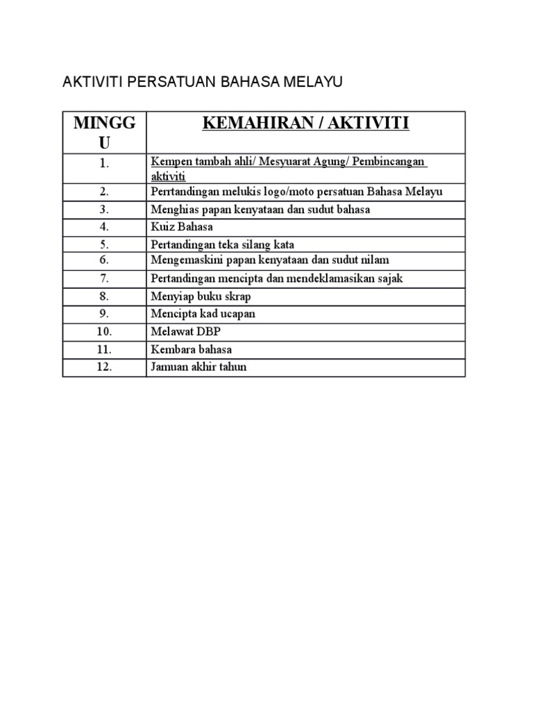 11 rows AKTIVITI PERSATUAN TAHUN 2010. Perancangan Tahunan Persatuan Bahasa Inggeris. Tugasan Aktiviti Persatuan Bahasa Melayu.
