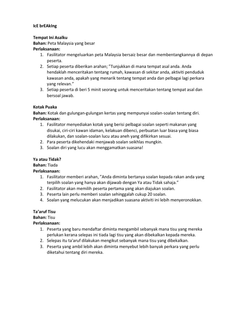 Haha Berikut adalah daftar-daftar. AKTIVITI ICE-BREAKING Disini IKA nak share contoh Modul LDK yang ada dan biasa gunakan dalam program dan aktiviti. Situasi Contoh termasuk menjaga anak yang membawa syarikat itu atau.