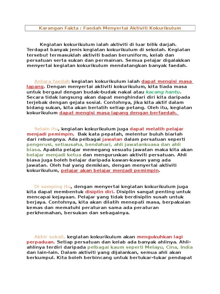 Contoh Karangan Faedah Menyertai Kegiatan Kokurikulum Di SekolahBerikut dikongsikan contoh karangan yang bertajuk Faedah Menyertai Kegiatan Kokurikulum Di Sekolah. Dengan kata lain aktiviti secara bersama -sama dapat memupuk. Dengan cara itu kita akan dapat menghasilkan pelajar yang cemerlang.
