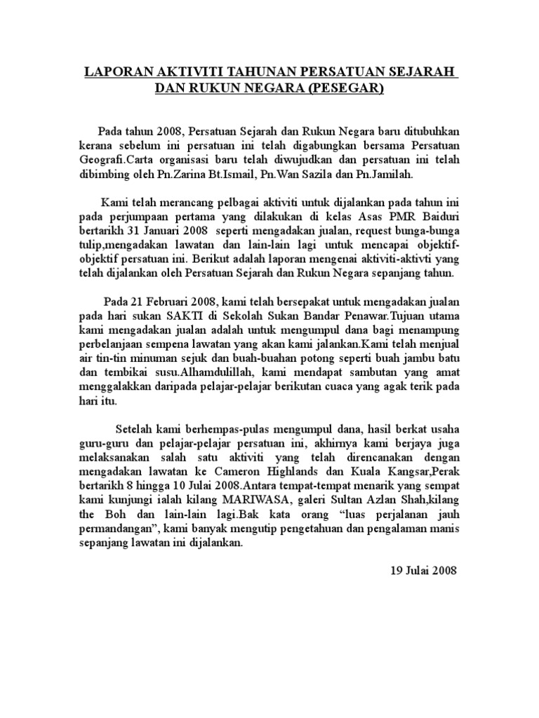 Rancangan aktiviti kelab sejarah. Seiring dengan namanya maka aktiviti-aktiviti yang dijalankan menerusi kelab ini adalah berlandaskan kepada kelima-lima prinsip Rukun Negara yang bermalamat agar ianya bukan. Membincangkan kelab mesyuarat bersuara agenda sepanjang Membentang tahun laporan tahunan kelab Membentang penyata kewangan.