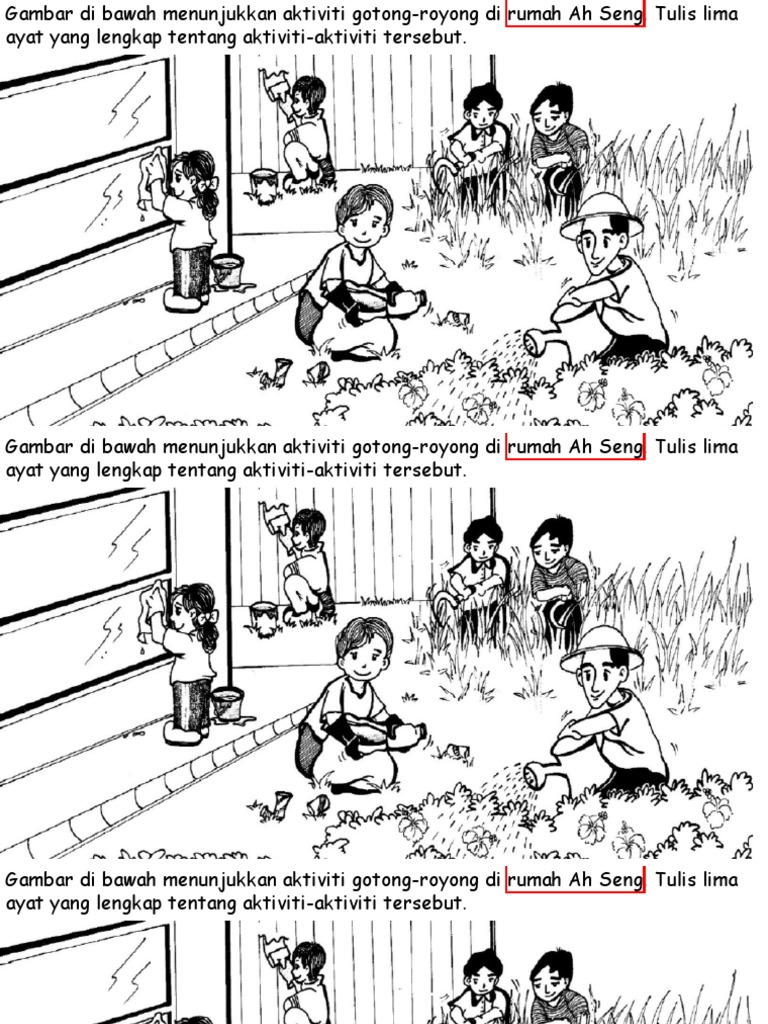 Melalui aktiviti ini juga jiran jiran menyiapkan kerja-kerja dalam masa yang singkat. Tulis lima ayat yang lengkap tentang gambar di bawah. 1 Penduduk Kampung Wawasan mengadakan gotong-royong membersihkan sungai.