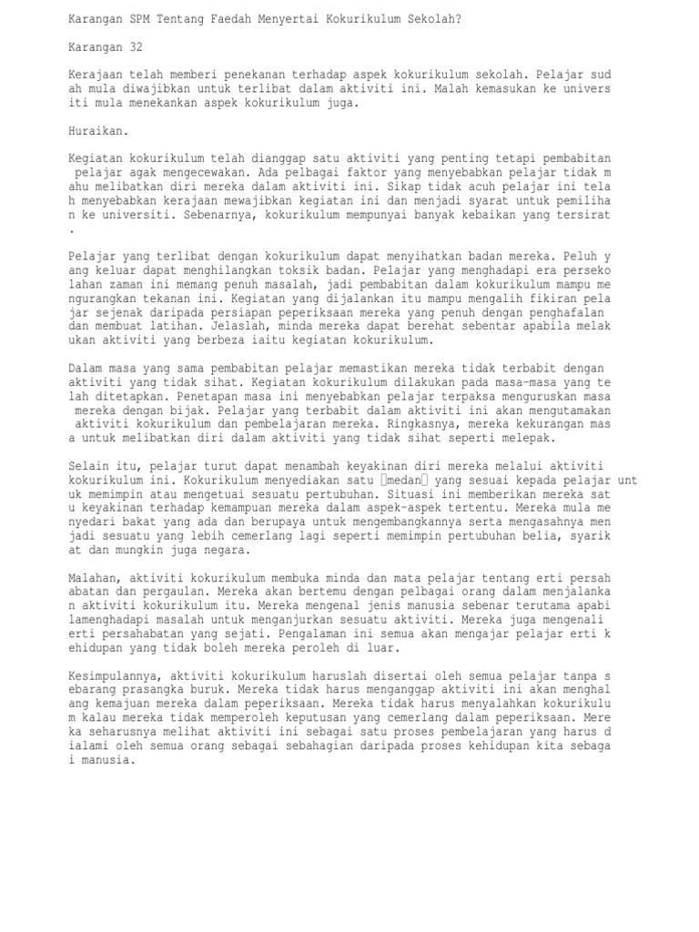 Koleksi Contoh Karangan SPM Bahasa Melayu Sijil Pelajaran Malaysia Berikut adalah contoh-contoh karangan mengikut tema yang selalu digunakan sebagai tajuk soalan karangan Bahasa Melayu. Karangan kebaikan Menyertai Aktiviti Kokurikulum. Aktiviti kokurikulum terbahagi kepada beberapa bahagian iaitu sukan permainan dan unit beruniform.
