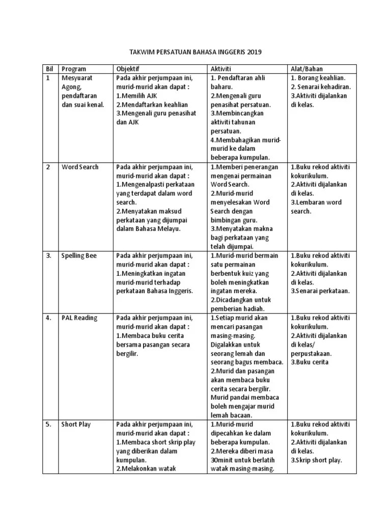 CONTOH RANCANGAN TAHUNAN PERSATUAN DAN KELAB. Panduan Penubuhan Persatuan Bahasa Inggeris Menyedari hakikat bahawa kemahiran berkomunikasi amat penting dan diberi penekanan pada masa ini Persatuan Bahasa Inggeris di sekolah wajarlah digerakkan dengan lebih aktif bagi memenuhi tuntutan tersebut. Kategori Bahasa Inggeris Sekolah Rendah Peringkat Daerah Sepang 2020 - Syabas dan tahniah diucapkan kepada wakil SKTPP adik Rayyan Hayy.