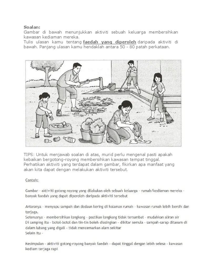 Bina 5 Ayat yang Lengkap Berdasarkan Gambar Aktiviti Gotong-royong April 6 2018 at 606 pm 14 comments. Melalui aktiviti gotong-royong jiran-jiran tanpa mengira perbezaan bangsa dan agama akan bersama-sama menjalankan aktiviti yang sama. Saya berasa sangat gembira kerana dapat bergotong-royong bersama-sama.